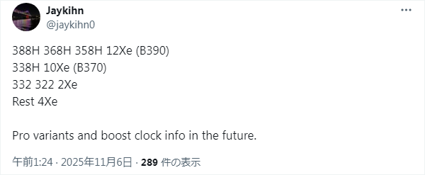 Jaykihn氏によると以前にリークされていた名称には誤りがあり、これがフルラインナップとのこと。ただ、ネーミングの頭の部分、『Core Ultra X9』や『Core Ultra X7』などは記されていません。またiGPUのXe数といった情報やTDPも別々にポストされています。