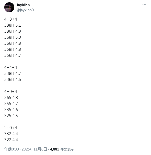 『Core Ultra X9』や『Core Ultra 5』の部分は、これまでのリークやGeekbench (リザルト1 / リザルト2)に実際に出てきた名称を参考にしています。一番上の『最大16コア / 最大12 Xe3モデル』は上記で合っているはずです。