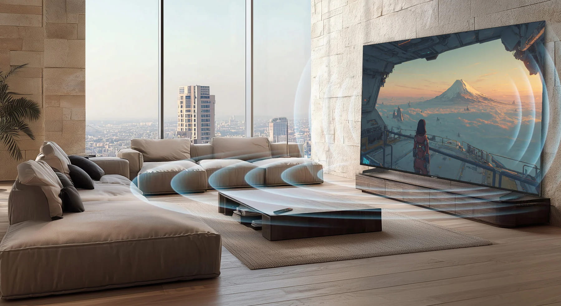 インターフェイスはHDMI 2.0 x3、オーディオラインアウト出力 x1、オプティカル音声出力 x1。HDMIケーブルが付属。サイズはスタンド付きで高さ1320 x 幅2228 x 奥行き386mm、スタンド無しで高さ1270 x 幅2228 x 奥行き90mm。