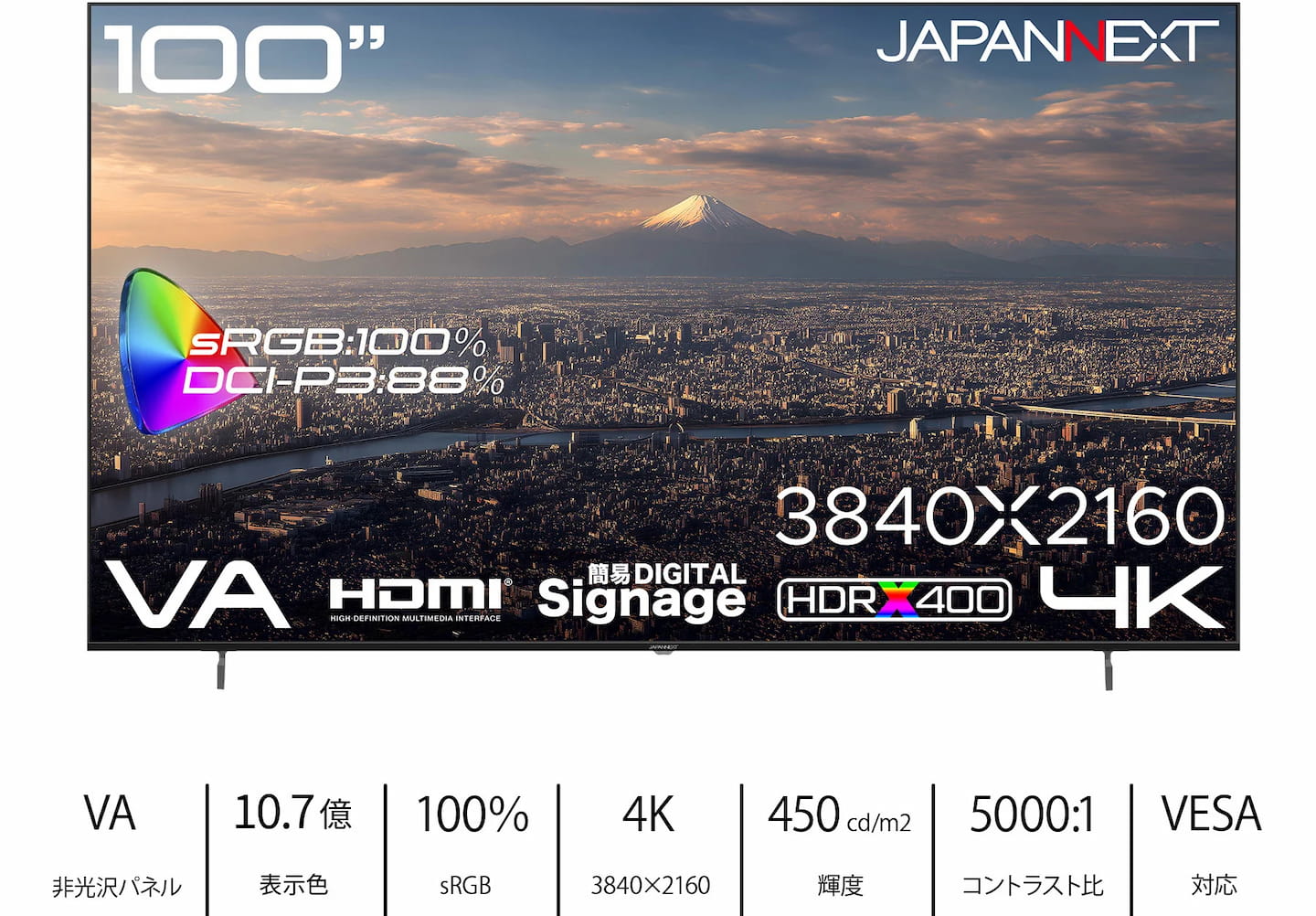 JAPANNEXT、100インチ4Kモニター発売。大迫力の映像、JN-V100U-Mシリーズ