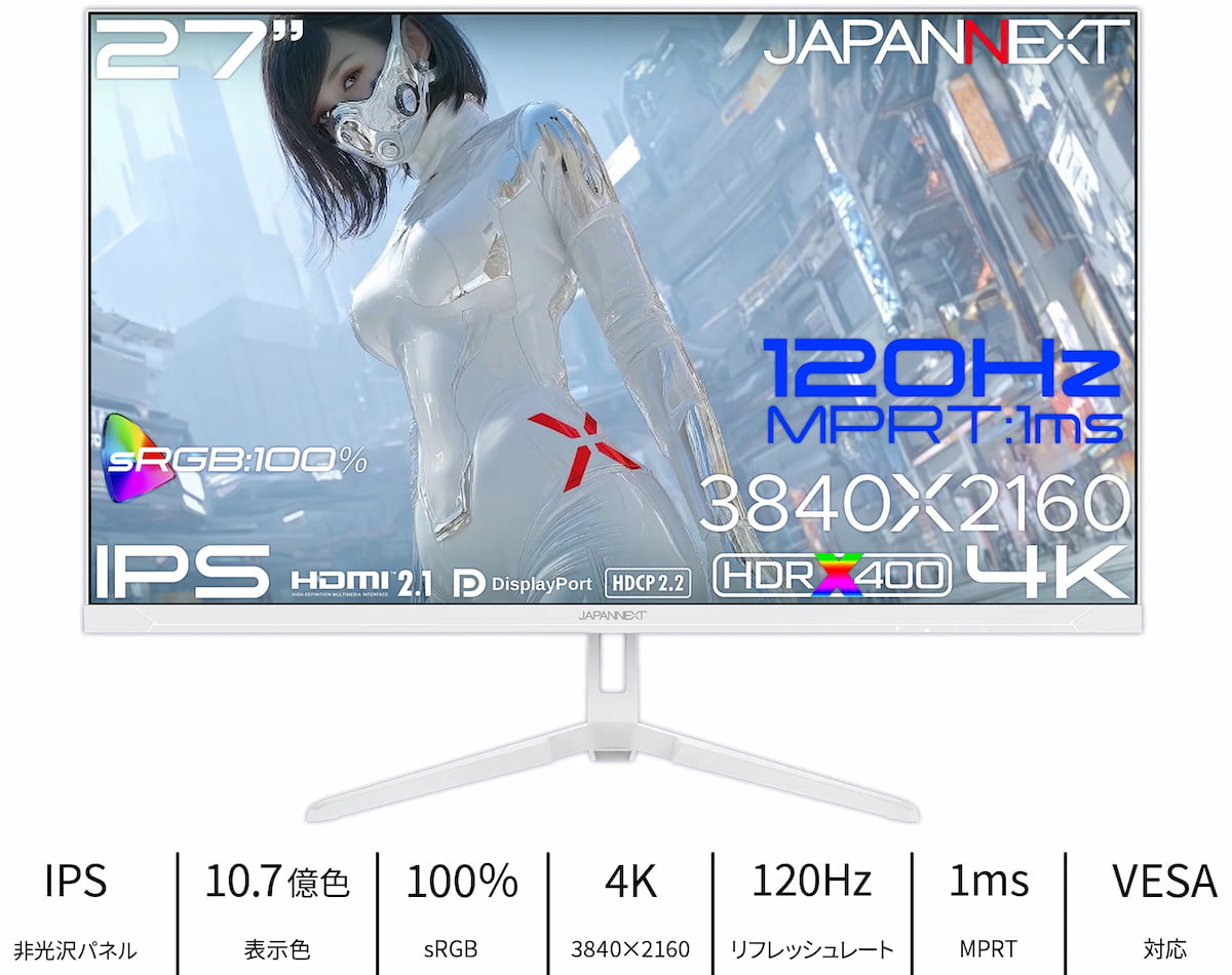 JAPANNEXTは、約3.7万円の4Kゲーミングモニター『JN-i27G120U2-W』を発売しました。