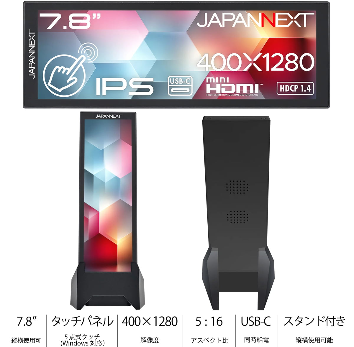 5:16の小型モバイルモニター『JN-MD-IPST784』発売。縦置き横置き両対応
