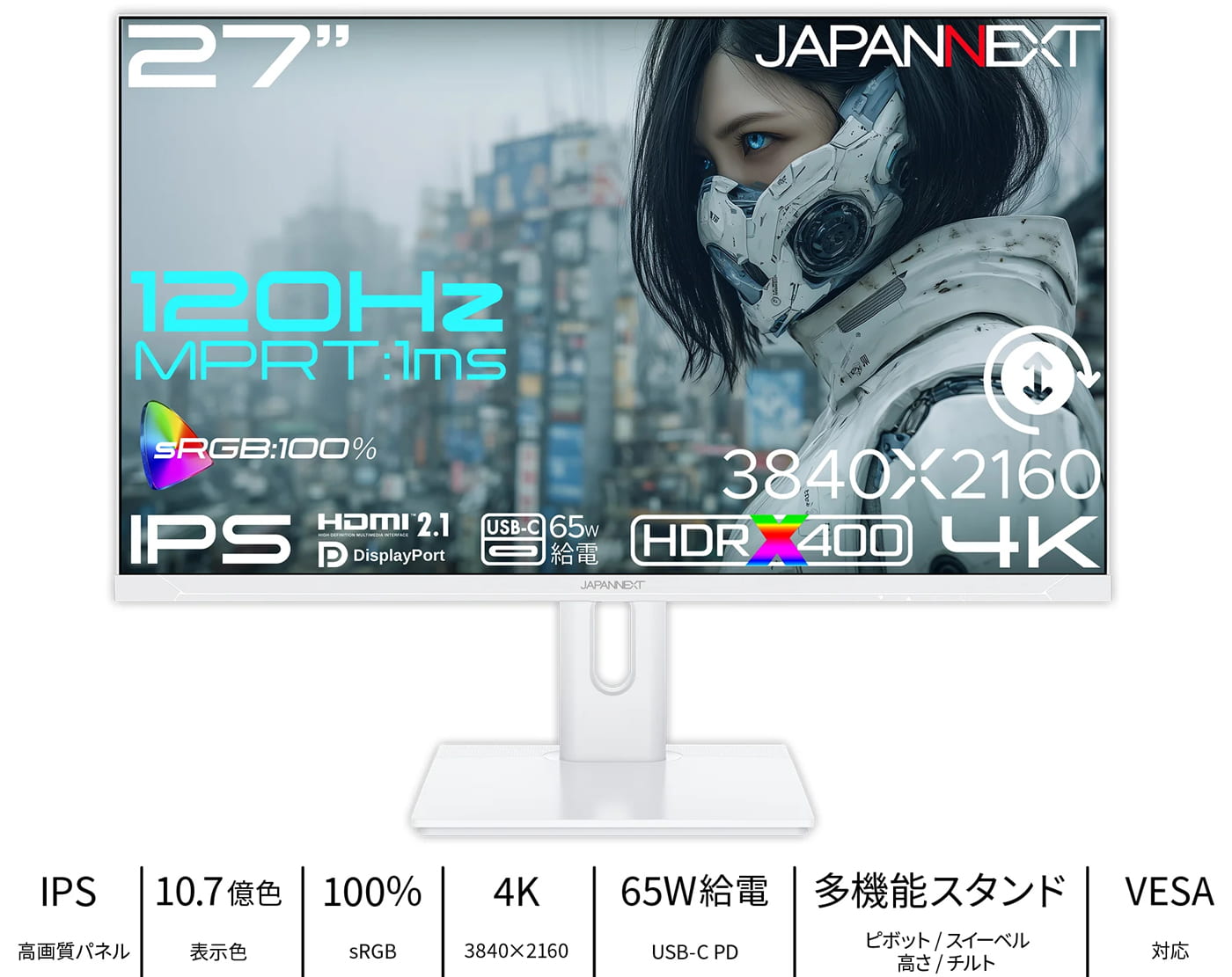 ホワイトカラーの4Kゲーミングモニター2機種発売。JAPANNEXTから『JN-IPS27G120U-HSPC6-W』『JN-IPS27G120U-W』