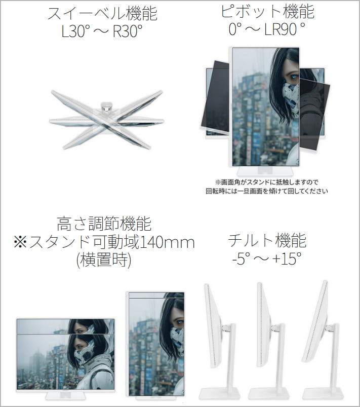 『JN-IPS27G120U-HSPC6-W』のインターフェイスは、DisplayPort 1.4 x1 (120Hz)、HDMI 2.1 x2 (120Hz)、USB-C x1 (120Hz)、オーディオ出力。その他、KVM機能搭載、昇降式多機能スタンド(スイーベル、ピボット、高さ調節、チルト対応)を採用。