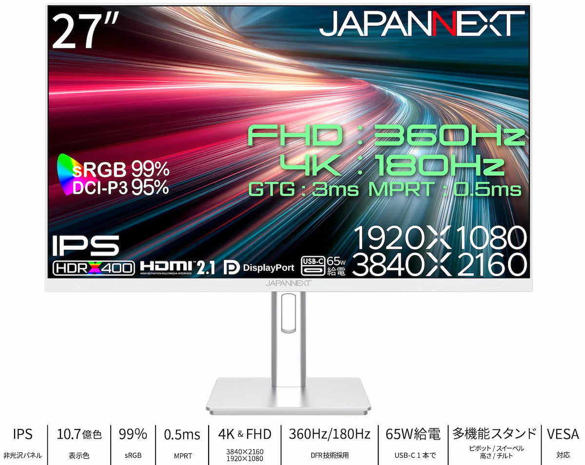 4K 180Hz/FHD 360Hz切替対応ゲーミングモニター発売。どんなゲームもこれでバッチリ。JAPANNEXT『JN-IPS27G1836UF-HSPC6』『JN-i27G1836UF-C6』