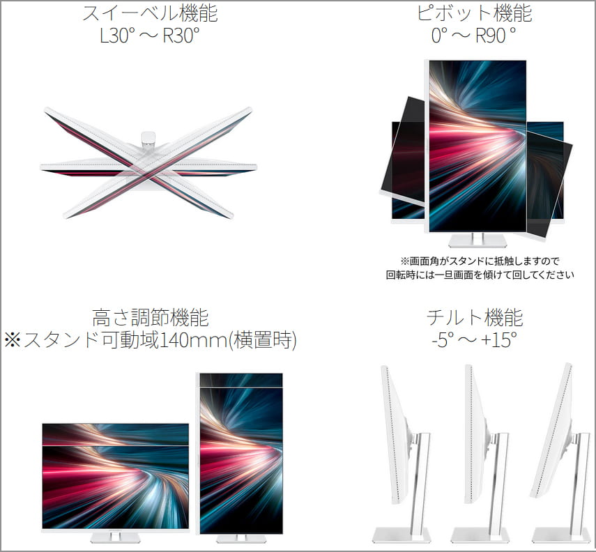 『JN-IPS27G1836UF-HSPC6』と『JN-i27G1836UF-C6』の違いはスタンド部分。前者は昇降式多機能スタンドを採用しており、高さ調整はもちろん、縦画面として使用できるピボット(回転)、画面を左右に動かすスイーベル(首振り)、モニターの前後の角度を変更するチルト機能(-5°~+15°)に対応しています。