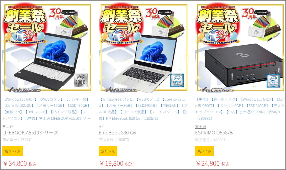 創業祭セールはジャンクワールドを運営する株式会社アールキューブの創業30周年を記念したセール。サブPCや普段使いなどに好適な中古ノートPC・小型デスクトップPCなどが格安にて販売されています。