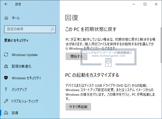 『回復』画面。開くと『設定』ウィンドウが勝手に閉じるなどの不具合が発生