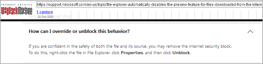 Microsoftが本アナウンスを更新しました。当初は、上記のようにファイルのプロパティを変更するだけしか案内されていませんでしたが、新たな対処方法を追加しました。
