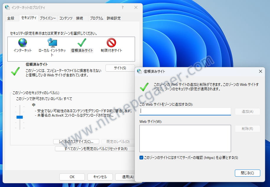[Windows] + [R]キーを押して『ファイル名を指定して実行』を開き、『inetcpl.cpl』と入力してエンターを押してくだい。すると『インターネットのプロパティ』が開くので、『セキュリティ』タブの『ローカル イントラネット』または『信頼済みサイト』にアドレスを追加することで、本仕様変更を回避できます。