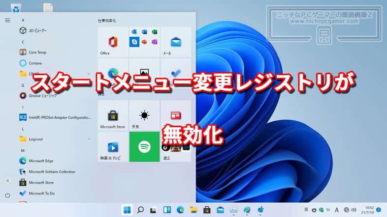 Windows11 Dev版 Build 22000.65にて、スタートメニューのスタイルを変更するレジストリが無効化されました。