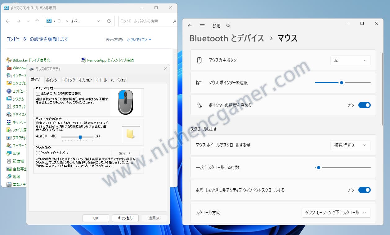 マウスの設定: コントロールパネルと『設定』