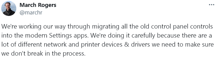 以前からMicrosoftはコントロールパネル内の機能を『設定』へと移していましたが、March Rogers氏によると、すべての機能を『設定』に移行する作業を進めているとのこと。