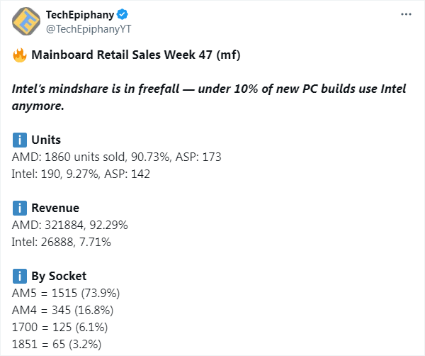 TechEpiphany氏が集計したデータによると、2025年第47週のマザーボード販売台数は以下。