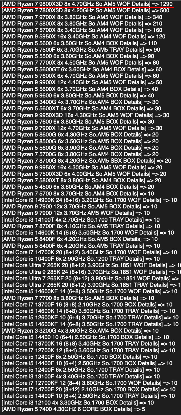 そして悲しいことに、IntelのCPUはLGA1200、LGA1700、LGA1851の3つすべてを足しても250台です。Ryzen 7 9800X3Dのわずか5分の1程度です。