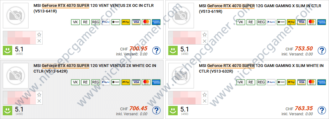 - MSI GeForce RTX 4070 SUPER 12G VENTUS 2X OC: 700.95 CHF