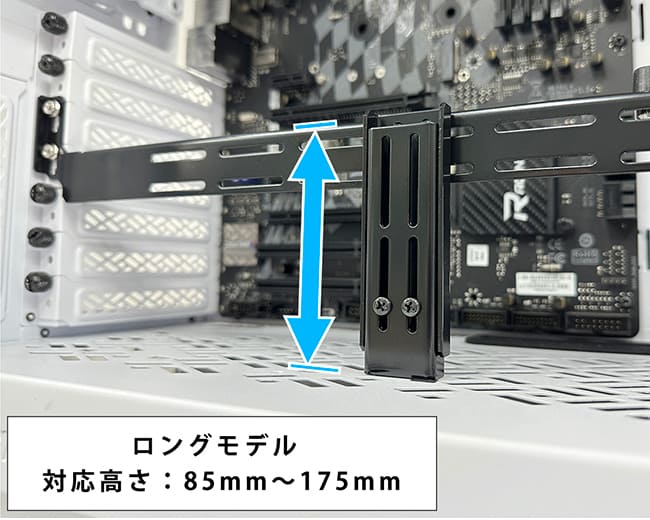 『VGAサポートステイPCI 突っ張り式』シリーズは、突っ張り部分の長さが40~85mmのミディアムと、85~175mmのロングの2モデル。