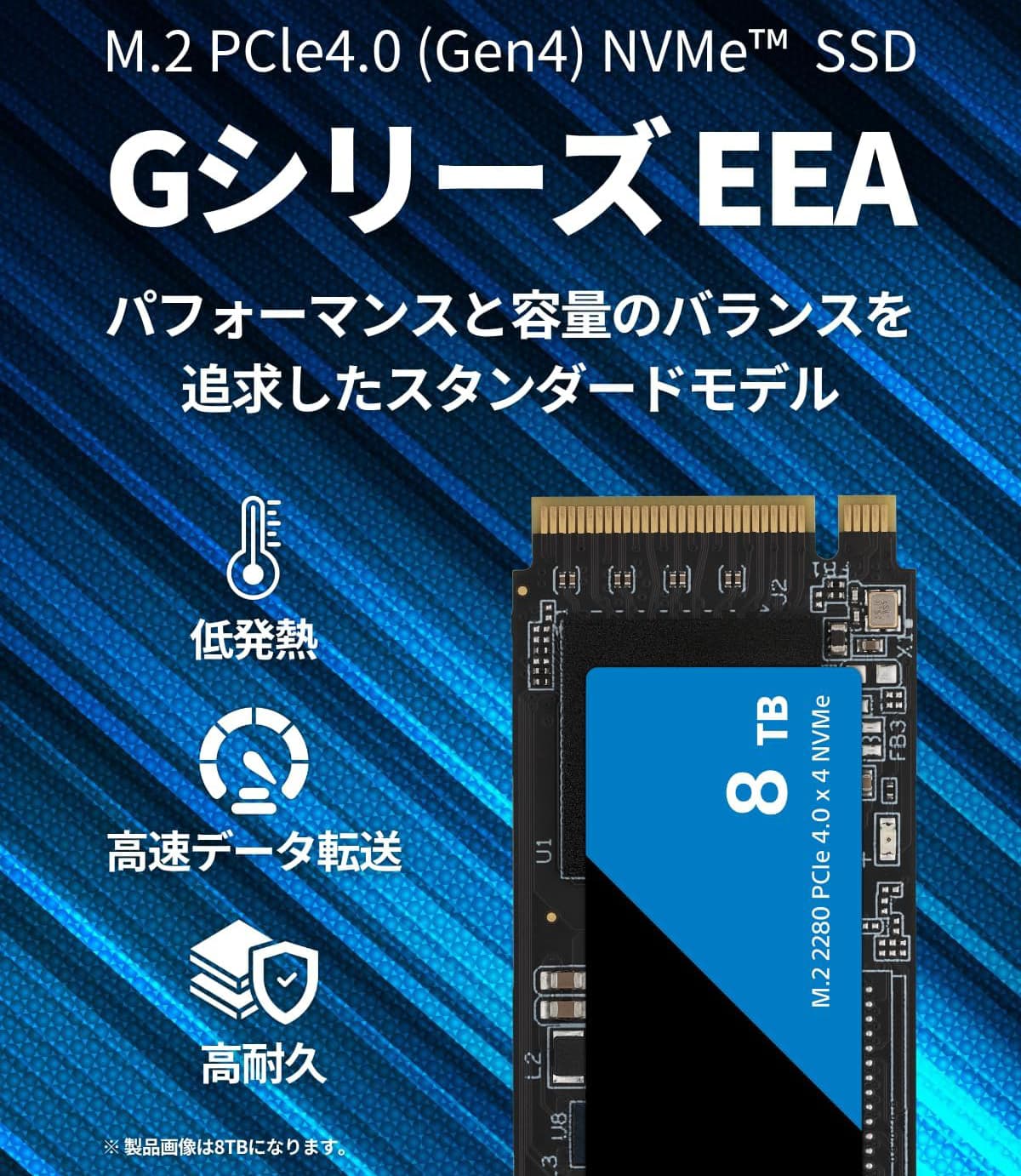 『GシリーズEEA』はパフォーマンスと容量のバランスを追及したM.2 NVMe SSD。PCIe 4.0に対応し、大容量SLCキャッシュ搭載により最大読み込み7000MB/s、最大書き込み6400MB/sの高速データ転送を実現。日常的な用途やゲームプレイでの使用など、実用性を重視した設計となっています。