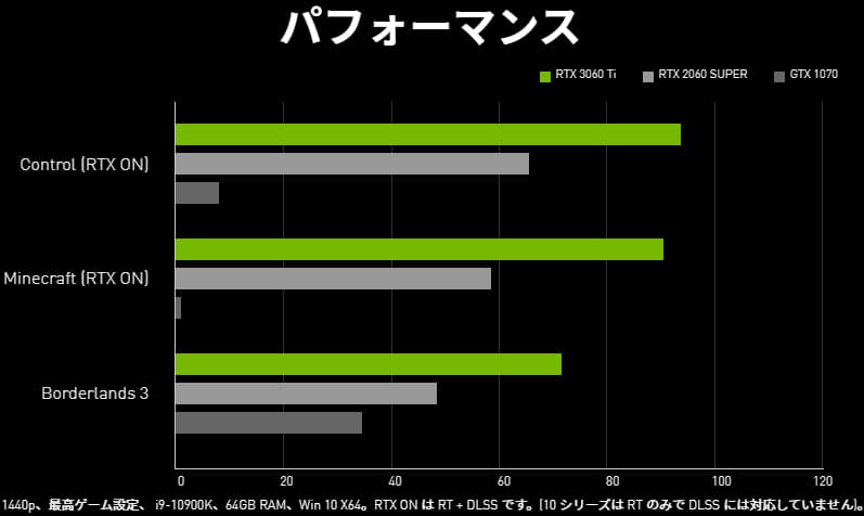 NVIDIAによると、RTX 3060 Tiは、前世代のRTX 2060 SUPERと比較して以下のようなパフォーマンス差があるとのこと。