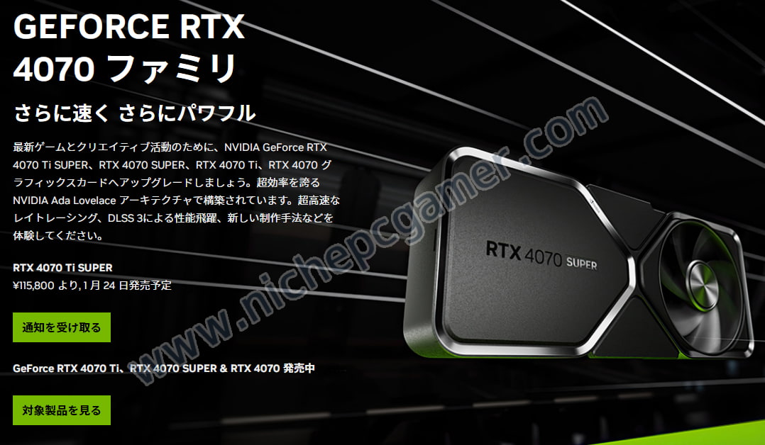 NVIDIAのサイト上ではGeForce RTX 4070 Ti SUPERの希望小売価格は115,800円と記されています。