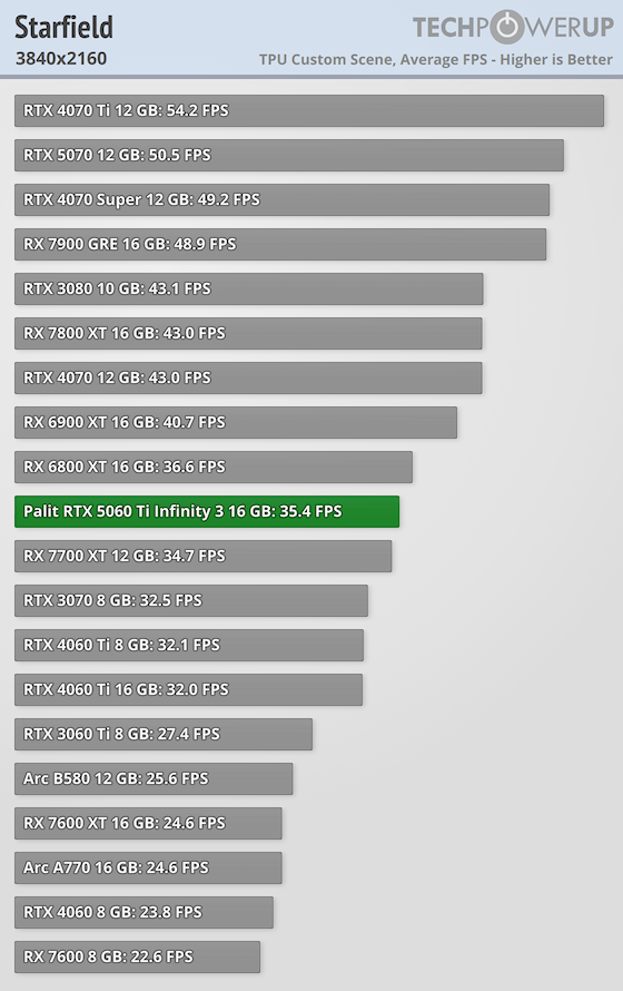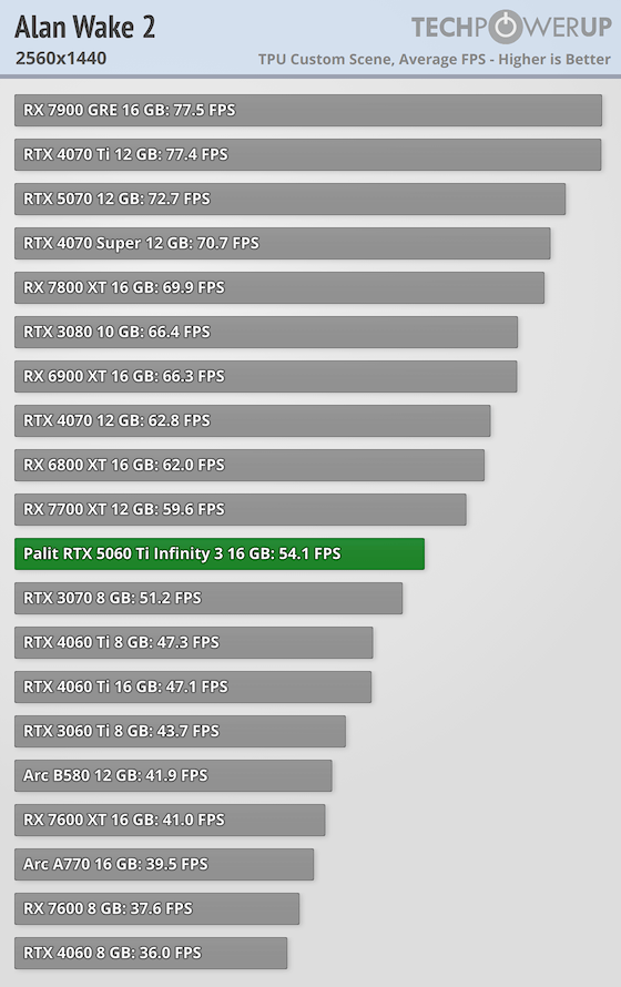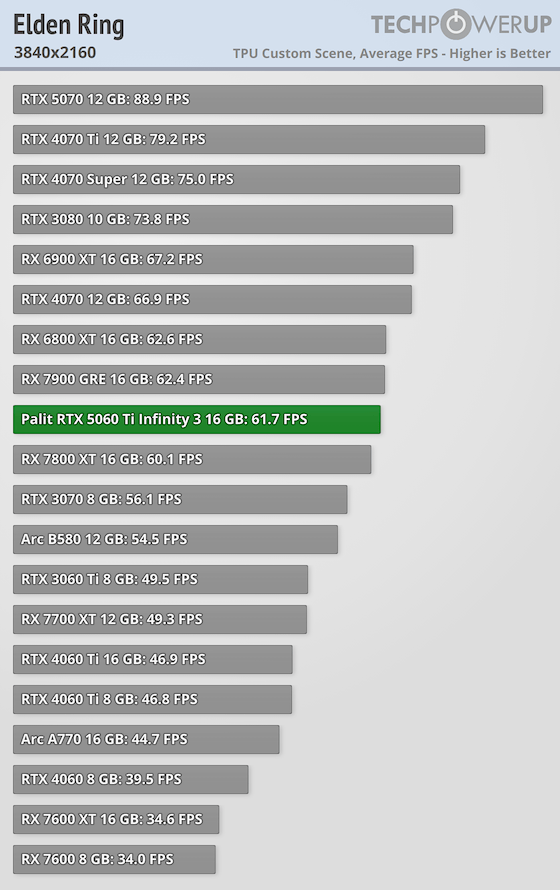 海外メディアのTechPowerUpにより、NVIDIA GeForce RTX 5060 Ti 16GBのゲームベンチマークが公開されました。そのリザルトがこちら。