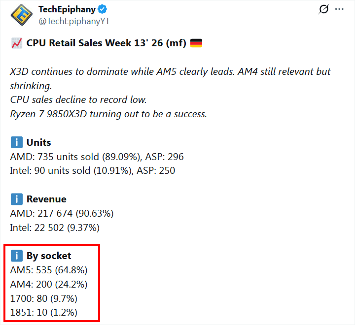 ドイツのPCショップ、Mindfactoryでは販売数のデータ(5~10台単位)が公開されており、TechEpiphanyはそれをもとに、週ごとのCPUの売れ行きを調査しています。