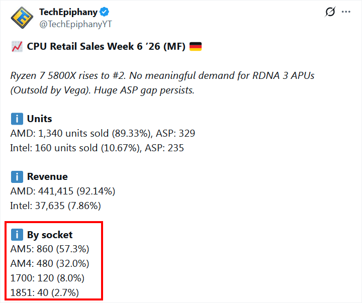 2026年第6週は、AM5 CPUが860個、AM4 CPUが480個、LGA1700 CPUが120個、LGA1851 CPUが40個、合計1500個のCPUが売れました。