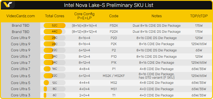 Nova Lake-SにはTDP 35W、65W、125W、175Wのモデルがあり、上位の52コアモデルと44コアモデルは175Wとなる。Intelはまだ正式名称を決定していないが、52コアモデルと44コアモデルはHEDTシリーズの後継となるCore Xブランドになると噂されている。 Intelは2026年第4四半期よりNova Lakeの量産を計画している。この部分については後ほど紹介したい。 ― VideoCardz |