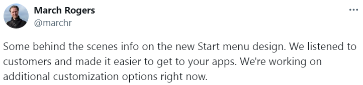 MicrosoftのPartner Director of DesignであるMarch Rogers氏は、X (旧Twitter)にてWindows11の新しいスタートメニューについて以下のように述べています。