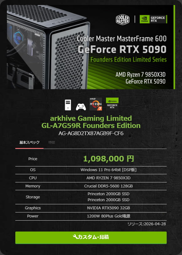 arkhive GeForce RTX 5090 Fouders Edition Limitedシリーズ』の発売を記念して、2026年5月25日(月)までの間、先着100台でメモリを通常の64GB (32GB x2)から128GB (64GB x2)に無料アップグレード。さらに2TB SSDを無料で追加アップグレード。