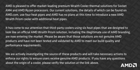 弊社は、Socket AM4およびRyzenプロセッサー向けに、市場をリードするプレミアムなWraith Coolerサーマルソリューションを提供できることを嬉しく思います。Wraith Prism Coolerの仕様は4本のヒートパイプを使用しており、これよりヒートパイプの増えたWraith Prism Coolerを新たに投入する予定はありません。 現在、弊社のブランドを不正に使用し、6つのヒートパイプを使用したサードパーティ製の偽物のWraith Prism Coolerが市場に出回っていることを確認しています。このような製品は、正規の弊社製品ではなく、弊社が定める品質およびパフォーマンス要件を満たすために、弊社によってテストおよび検証されていないことにご注意ください。 弊社はこの製品の供給元を積極的に調査しており、ユーザーが正規の弊社製品を確実に入手できるよう、必要な措置を講じて参ります。 |