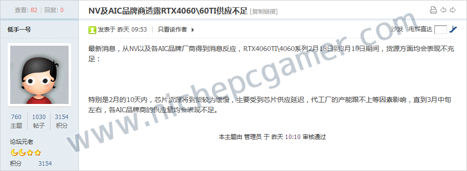 NVIDIAおよびAICブランド各社から得た情報によると、2024年2月18日から3月10日までの間、GeForce RTX 4060とGeForce RTX 4060 Tiの出荷量が減少するという。 ファウンドリの生産能力が追いついておらず、GPUチップの供給が遅れていることなどに起因しているという。 [Source: 博板堂 (※要ログイン)] |