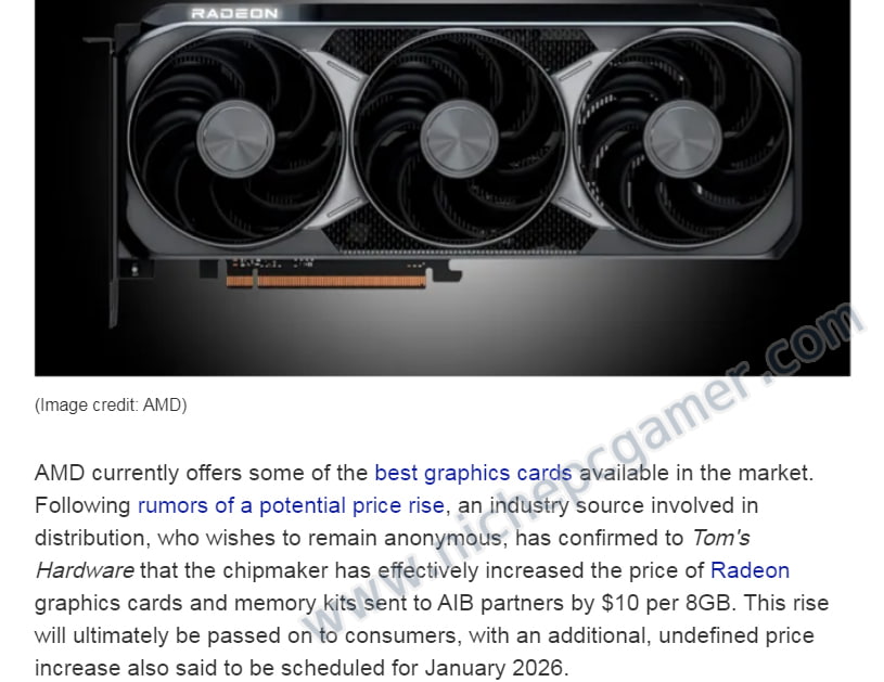 Radeon RX 9000シリーズなどAMDのグラボ製品が値上げされるとの噂が囁かれている。この件について、匿名を条件に業界関係者が私たちに語ったところによると、AMDがAIBパートナー(グラボメーカー)向けに出荷するGPU + VRAMのセット価格は、8GBあたり10ドル引き上げられたという。 この値上げ分は、最終的に小売価格にも反映される見通しだ。さらに、2026年1月にも追加の値上げが予定されているという。 Ryzen 9000シリーズなどのAMDのCPU製品も値上げされるとの噂も出ている。匿名を条件に2人の業界関係者(うち1人は米国大手ディストリビューター)が私たちに語ったところによると、Ryzenプロセッサーが値上げされるという兆候はこれまでのところ見られず、近いうちにそのような変更が実施されるということを示す証拠もないという。 AMDは今のところRyzenプロセッサーの値上げを行っていない。 ― Tom’s Hardware |