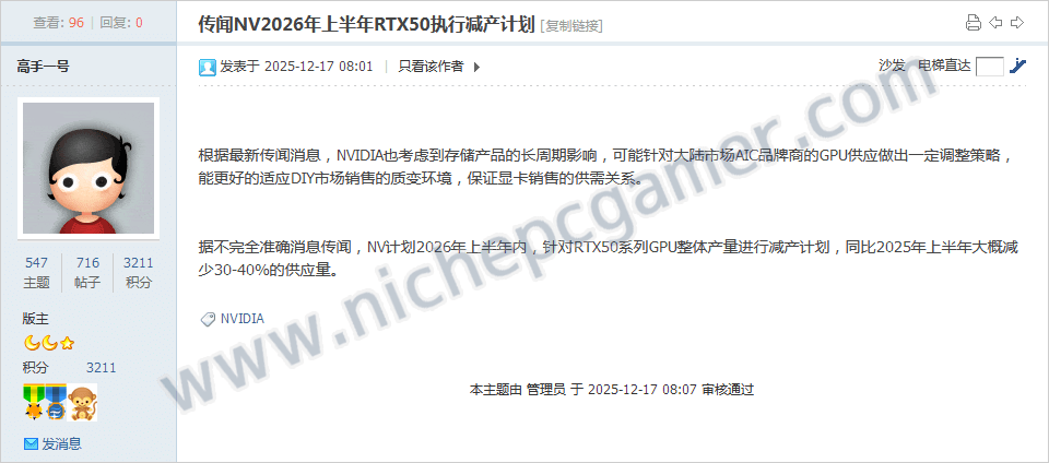 高手一号氏によると、NVIDIAは2026年上半期にGeForce RTX 5000シリーズ用GPUを減産し、中国向けの出荷量を2025年上半期比で30~40%減少させる可能性があるとのこと。