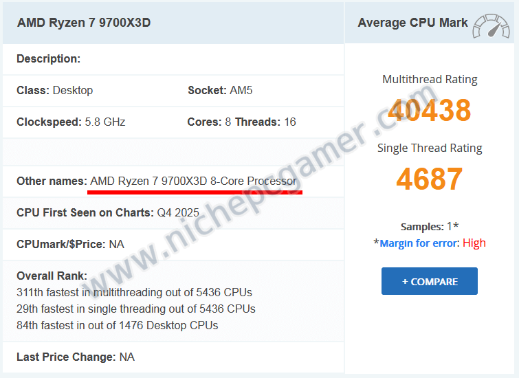 AMD未発表のRyzen 7 9700X3DがPassMarkに掲載!Ryzen 7 9800X3Dの下位モデル