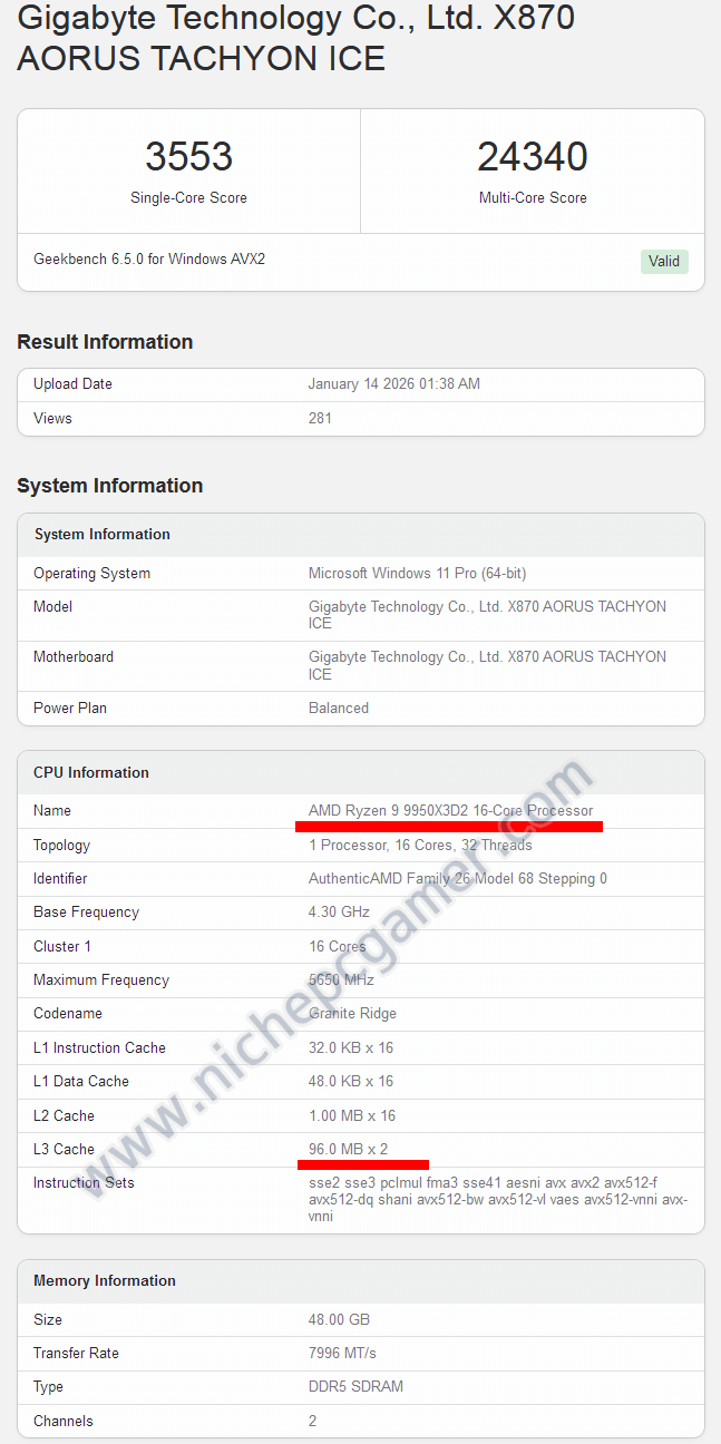 ここまではこれまにリークされてきたRyzen 9 9950X3D2のスペックと一致しています。