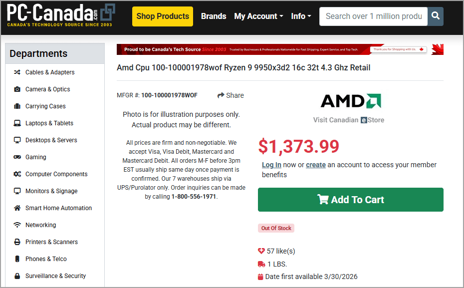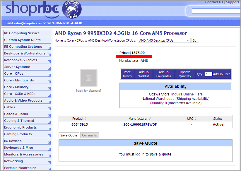 Ryzen 9 9950X3D2 Dual Editionが掲載されたのはカナダのPCショップ、PC-CanadaとShopRBC。そのお値段がこちら。