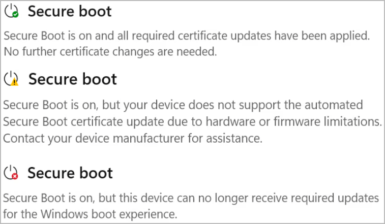 セキュアブートは有効になっていますが、お使いのデバイスには既知の問題があります。リスクを軽減するため、Microsoftとパートナーが解決に取り組んでいる間、セキュアブート証明書の更新は一時的に停止されています。問題が解決され次第、更新は自動的に再開されます。 | 対応は必要ありません。問題が解決次第、自動的に新しいセキュアブート証明書が配信・インストールされます。 |