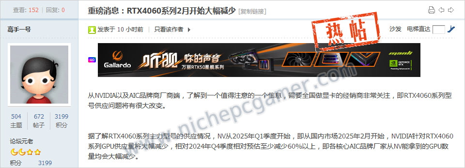 NVIDIAおよびAICグラボメーカーからGeForce RTX 4060の供給に関する新たな情報を得た。 NVIDIAは2025年2月以降、グラボメーカーへのGeForce RTX 4060用GPUの供給を大幅に減少させる予定だ。過去3か月と比較して、少なくとも60%以上減少することが見込まれている。 ― 博板堂, 高手一号 |
