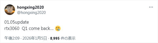 情報の発信源はハードウェアリーカーのhongxing2020氏。同氏によると、2026年第1四半期にGeForce RTX 3060が「帰ってくる」とのこと。
