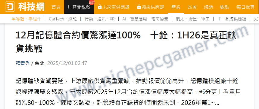 メモリモジュールメーカーTeamGroupのGMであるGerry Chen氏によると、主要メモリメーカー3社(Micron、SK hynix、Samsung)が、2025年12月のメモリ / DRAM契約価格を大幅に引き上げるという。中には前月比で80~100%も値上げするメーカーもあるという。 Gerry Chen氏は、真のメモリ不足はまだ来ておらず、2026年前半に入ってから本格的に不足する可能性が高いと見ている。 彼の予測では、この供給不足は少なくとも2027年末まで続き、場合によってはさらに長期化するとされている。 メモリの高騰はもうすでに顕著に現れている。64GBのDDR5メモリがPS5本体より高価になるケースも出ている。 ― DigiTimes / Tom’s Hardware |
