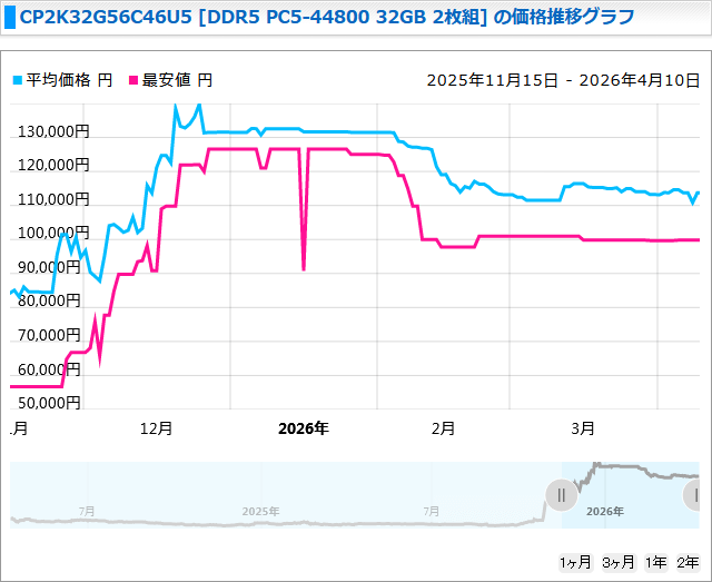 日本国内において、DDR5メモリモジュールの小売価格は2026年1月のピーク時よりも値下がりしています。64GB (32GB x2) DDR5メモリの価格推移の一例が以下。
