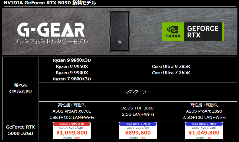 CPUにAMD Ryzen 7 9800X3DやRyzen 9 9950X3Dを搭載し、グラボにGeForce RTX 5090、GeForce RTX 5080、GeForce RTX 5070 Ti、GeForce RTX 5060 Ti 16GBなどを組み合わせた、Ryzen 9000シリーズ + GeForce RTX 5000シリーズモデルは多数のラインナップが注文可能となっています。