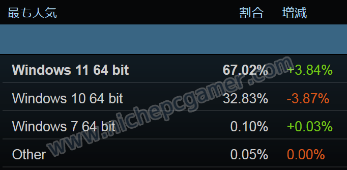 Windows11が+3.84%で67.02%、Windows10が-2.96%で33.74%となりました。SteamではWindows11のシェアが3分の2を超えました。