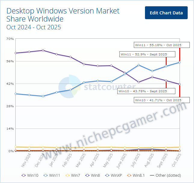 2025年10月のワールドワイドでのデスクトップPC Windowsシェア率は、Windows11が55.18%でシェア1位、Windows10が41.71%でシェア2位。