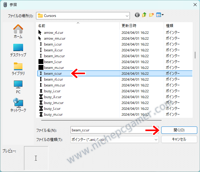『マウスのプロパティ』が開いたら『ポインター』タブを開いて、『カスタマイズ』項目の『テキスト選択』をダブルクリックしてください。