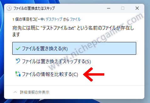 ファイルエクスプローラー(エクスプローラー)などで同名のファイルを移動・コピー・上書きする際、『ファイルの置換またはスキップ』というダイアログが表示されます。
