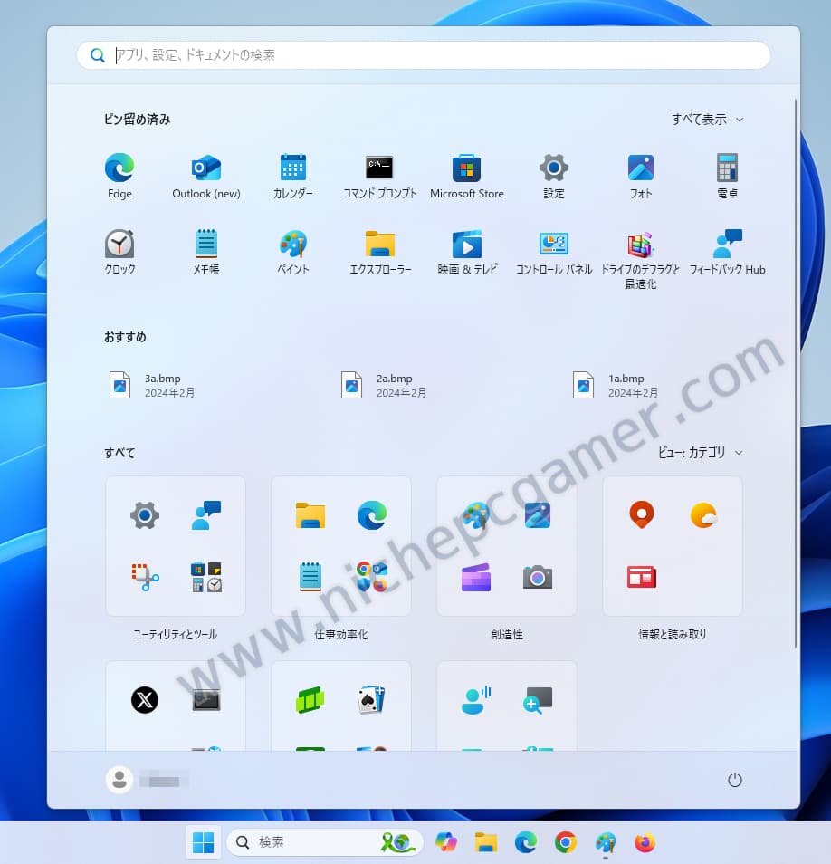 旧スタートメニューには『ピン留め済み』のアプリと『おすすめ』が表示されていました。そして、ピン留めされていないアプリに関しては、右上の『すべて』を選択する必要がありました。