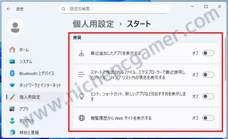 『設定』 → 『個人用設定』 → 『スタート』の『推奨』セクションにある、