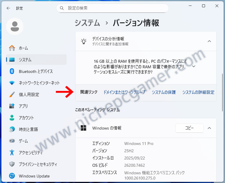Windows11 25H2およびWindows11 24H2の『バージョン情報』から『システムの詳細設定』等の項目が消えて『システムのプロパティ』ウィンドウを開けなくなりました。